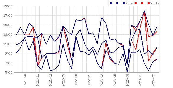 Lunderskov og omegn, prisudviklingen i ejerboliger, for de seneste år. Kurverne viser m² udbudsprisen for villaer.